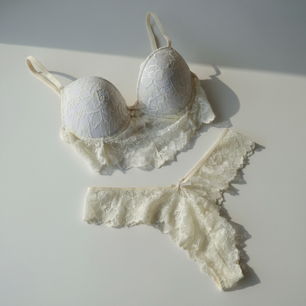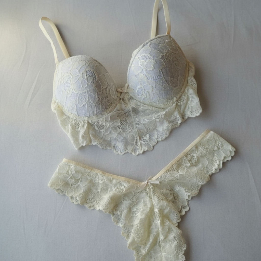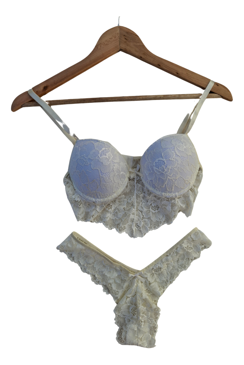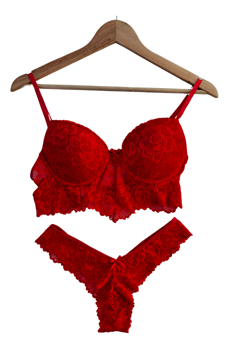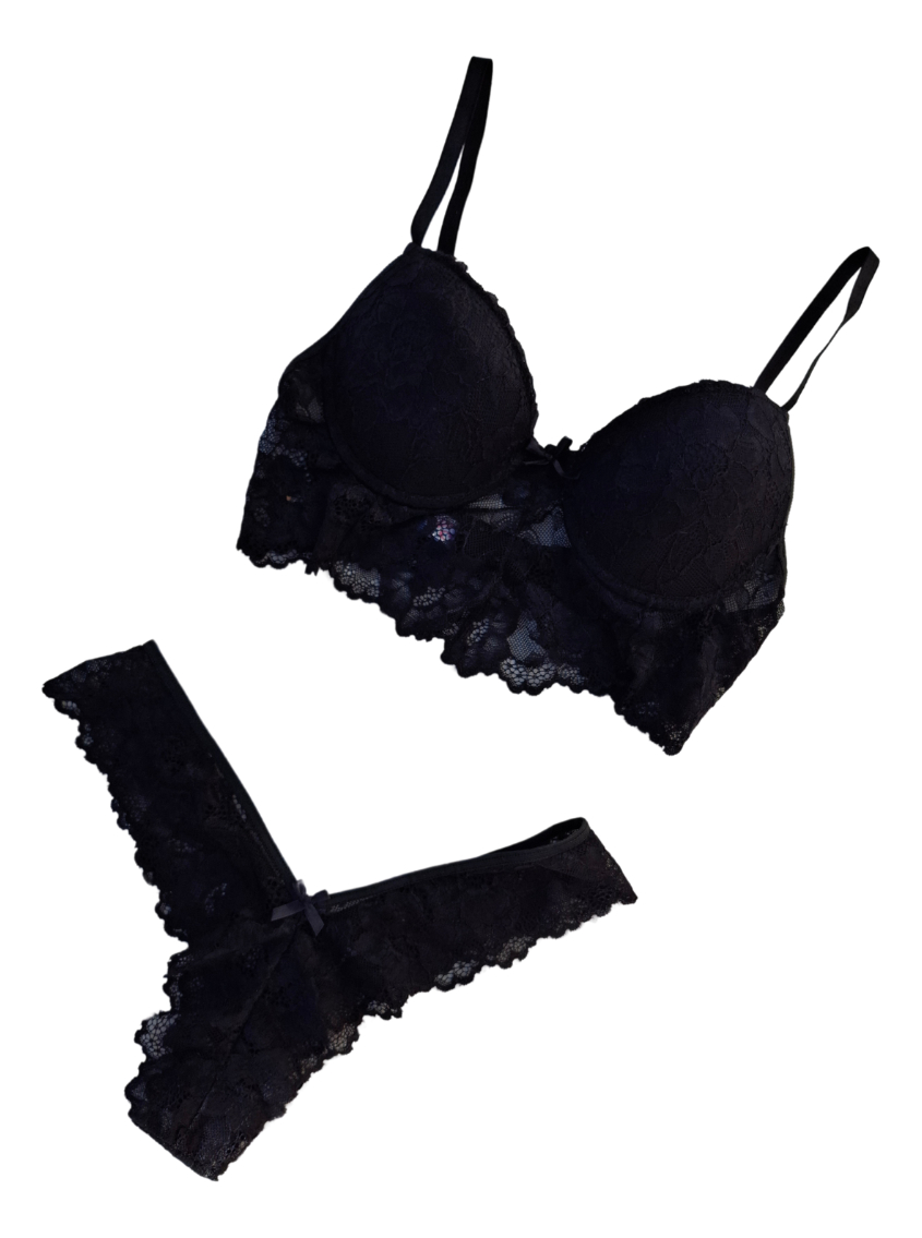 Elegante, delicado y con un toque de sensualidad. Este conjunto de lencería está confeccionado completamente en encaje, destacándose por su diseño sofisticado y femenino. El corpiño incluye un adorno en corte V que realza el escote con sutileza, mientras que la bombacha tipo culotte aporta comodidad y un calce perfecto. Ideal para quienes buscan una prenda íntima que combine estilo, suavidad y elegancia en cada detalle.