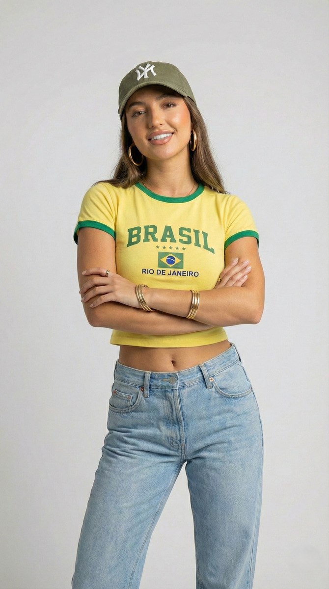 La Remera Baby Tee Brasil Crop Top es la elección perfecta para quienes buscan estilo y comodidad en los días cálidos. Confeccionada en suave algodón, esta prenda se adapta a la silueta femenina, ofreciendo un calce ideal para lucir en cualquier ocasión. Su diseño de cuello redondo y mangas cortas la convierte en una opción versátil que se puede combinar fácilmente con diferentes outfits.